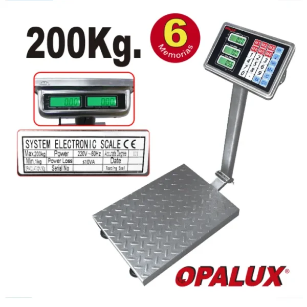 BALANZA C/BRAZO ELECT. “OPALUX” 200KG DOBLE DISPLAY 6 MEMORIAS CABEZA METAL BAT4V4AMP BASE 35X45CM CJX1