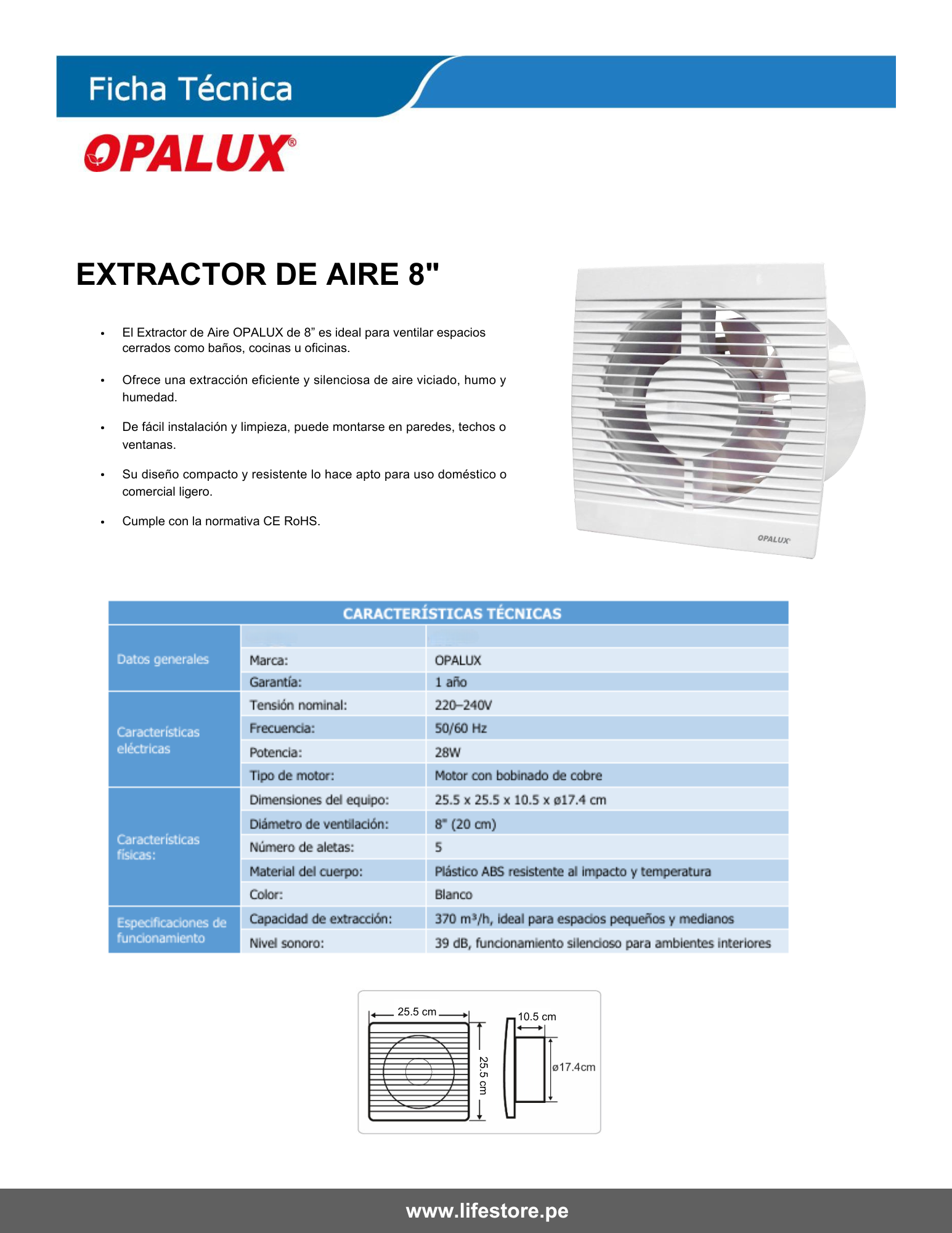 EXTRACTOR DE AIRE 8″ 28W “OPALUX” 220-240V 50-60HZ, 370M3/H 39DB CARCASA ABS (CJX6) CONEXIÓN CIELO RAZO