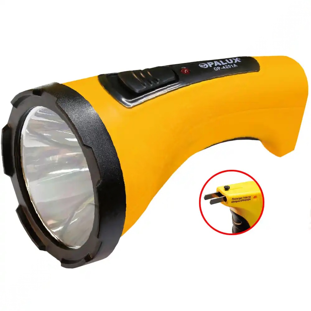 Linterna Recargable OPALUX 5W Amarilla LED 110 mts de alcance conector a pared 220v de 2 tiempos alta y baja uso practico y ligero