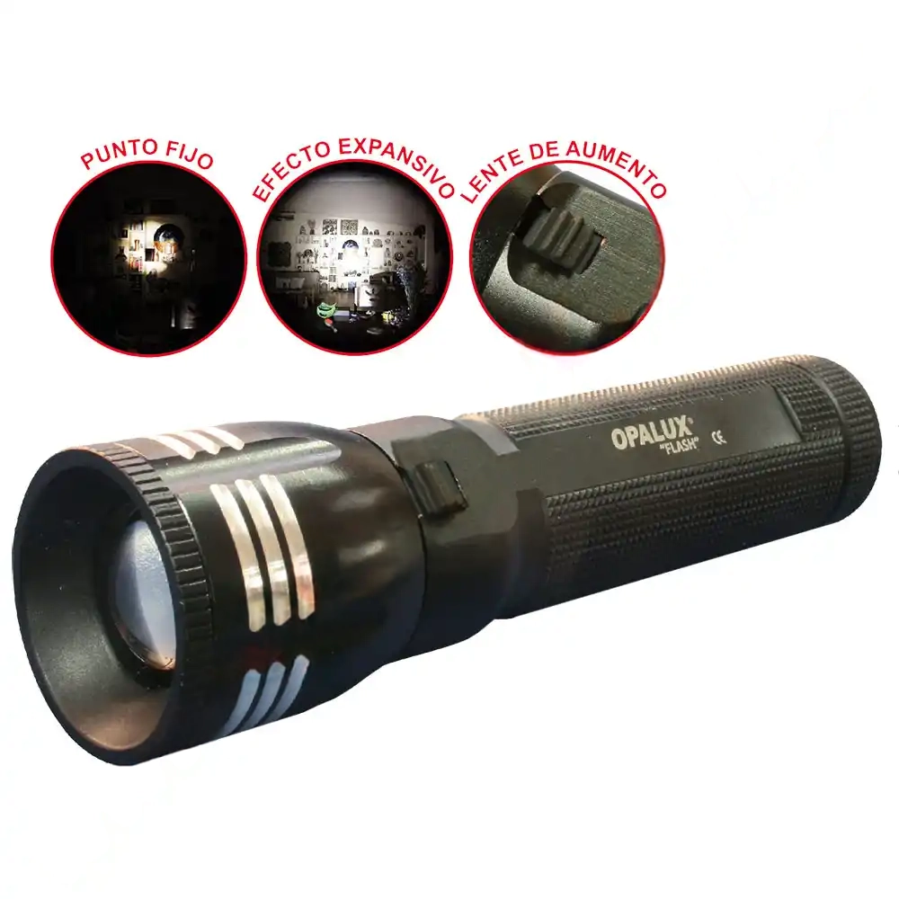 Linterna uso a pilas LED 8W “Opalux” con lente de aumento hasta 100 MTS aluminio color negro