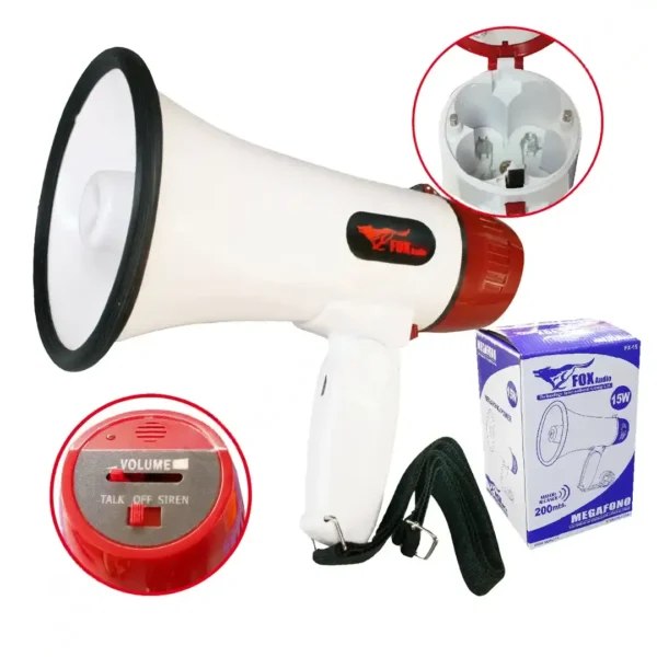 Megáfono de 15W “Fox Audio” micrófono, grabación, sirena, usa 4 pilas C