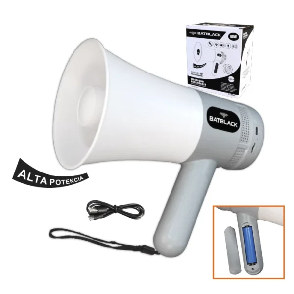 MEGAFONO RECARGABLE 60W, USB, BT, SD, CON GRABACIÓN 350 SEG. BATERIA 3.7V, 1800 MAH, 18650 /INDICADOR DE CARGA, CABLE TIPO C