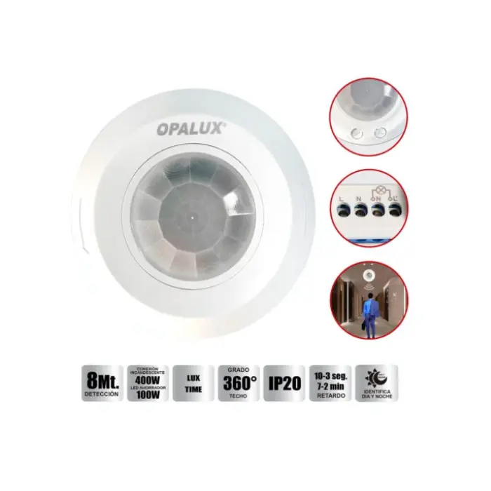 Sensor de movimiento 360° para techo detección a 8 mts horizontal tecnología PIR instalación hasta 4mts altura tiempo 10 seg – 7 min.