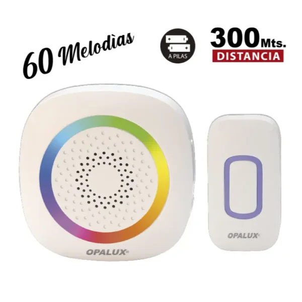 TIMBRE INALÁMBRICO CON LUZ RGB (PILA-PILA) “OPALUX” 60 MELODÍAS PULSADOR PILA 2032, RECEPTA 3 PILAS AAA